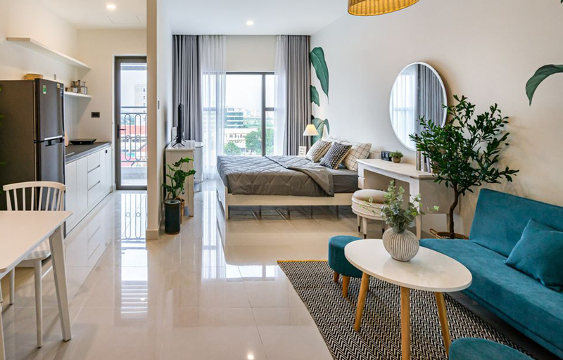 • Không gian mở: phòng khách, phòng ngủ, bếp chung một mặt bằng, chỉ phân tách bằng thảm, kệ, rèm.